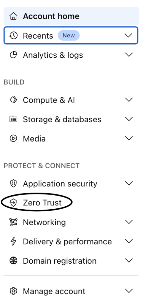 O Cloudflare Tunnel é gerido através da plataforma Zero Trust. Basta procurar por zero trust na barra de menú lateral esquerda.